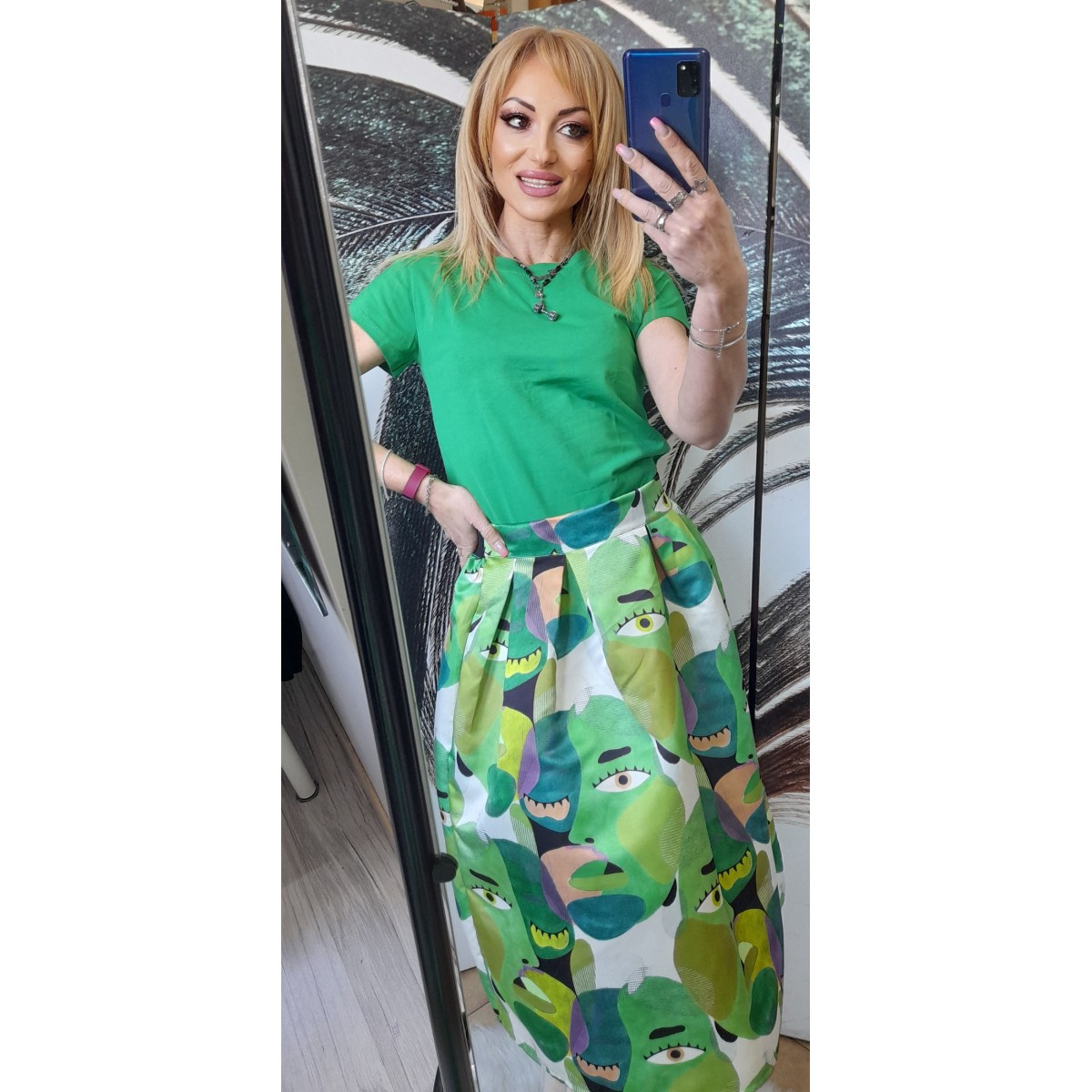 - gonna lunga a pieghe, cintura in vita tono su tono, vestibilità morbida, taglia unica;- t-shirt bianca con scollo tondo e maniche a volant, vestibilità morbida, taglia unica.