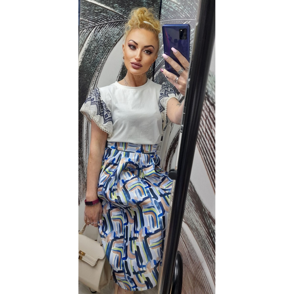 Gonna lunga in pizzo sangallo sui toni del bianco e blu scuro con cinturina beige in vita, vestibilità morbida, lunghezza alla caviglia. Taglia unica.
