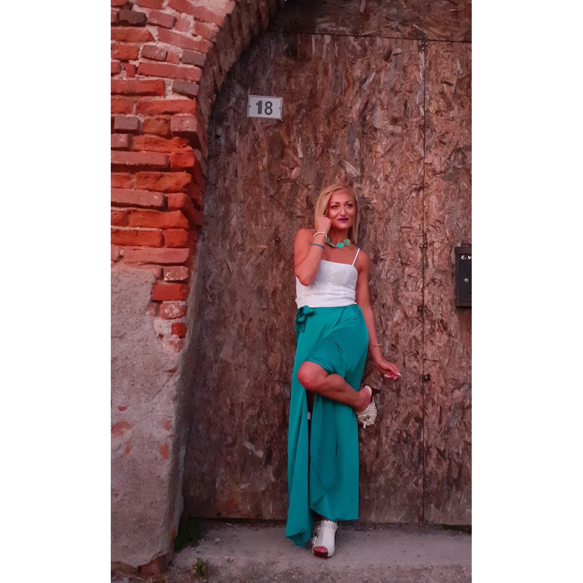 Gonna lunga a portafoglio color acqua marina con spacco in tessuto lucido simile al raso, cinturina in vita tono su tono, vestibilità morbida. Look chic ed elegante, perfetta da indossare con un top corto ed un paio di tacchi alti per slanciare la figura. Taglia unica.