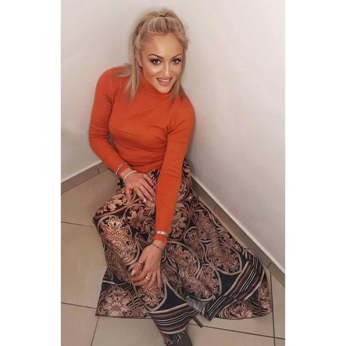Gonna lunga a fantasia floreale sui toni del beige ed oro, in tessuto leggero lucido simile al raso, lunghezza alla caviglia, vestibilità morbida, cinturino elastico in vita. Modello molto elegante e chic, perfetto da indossare con una maglietta aderente. Taglia unica