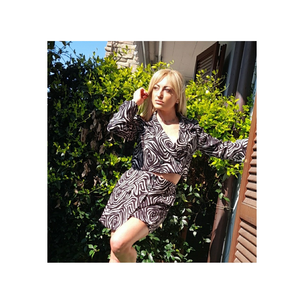 Completo fantasia giacca e gonna a pantaloncino | Lea Completo a fantasia sui toni del bianco e nero composto da:- giacchino corto doppio petto- shorts con gonna a portafoglio, lunghezza sulla coscia.Vestibilità slim - Taglia unica