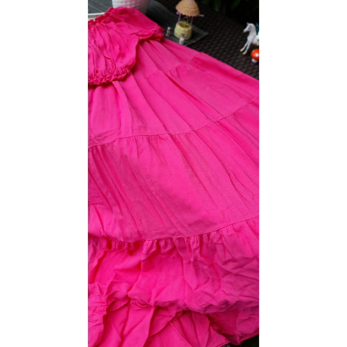 Gonna lunga a balze | Mary Gonna lunga in viscosa con tre balze, elastico in vita con cintura elasticizzata marrone, vestibilità morbida, lunghezza alla caviglia. Taglia unica